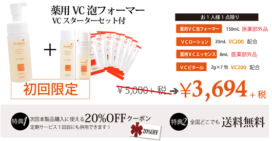「薬用VC泡フォーマ」は、この「VC200」とグリチルリチン酸カリウムや、プラセンタ、ビタミンA・E、5種類の植物エキスなどと1つになって、徹底的にニキビを予防、改善、跡の修復のために働いてくれるのです。